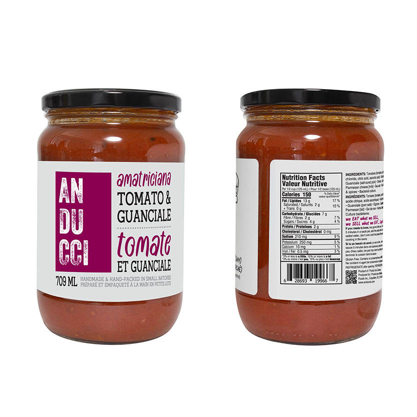 INGREDIENTS: Tomatoes (tomatoes, sali, calcium chloride, citric acid, ascorbic acid) • Extra virgin oliva oil • Guanciale (salt-cured pork) • Onions • Carrots • Celery • Parmesan cheese (milk) • Sea salt • Fresh herbs & spices • Bacterial culture.
