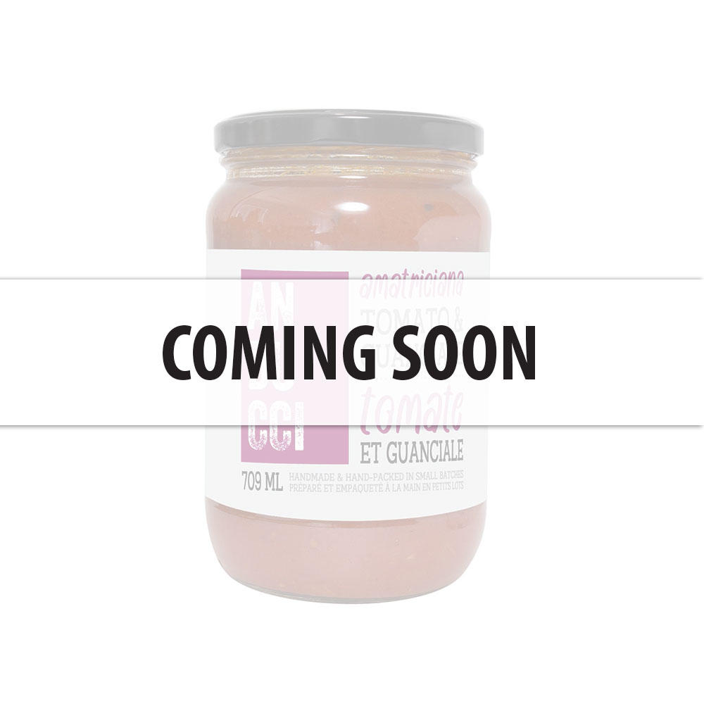 INGRÉDIENTS: Tomates (tomates, sel, chlorure de calcium, acide citrlque, acide ascorbique) • Huile d’olive extra vierge • Guanciale (porc salé) • Oignons • Carottes • Céleri • Parmesan (lait) • Sel de mer • Herbes fraîches et épices • Culture bactérienne.