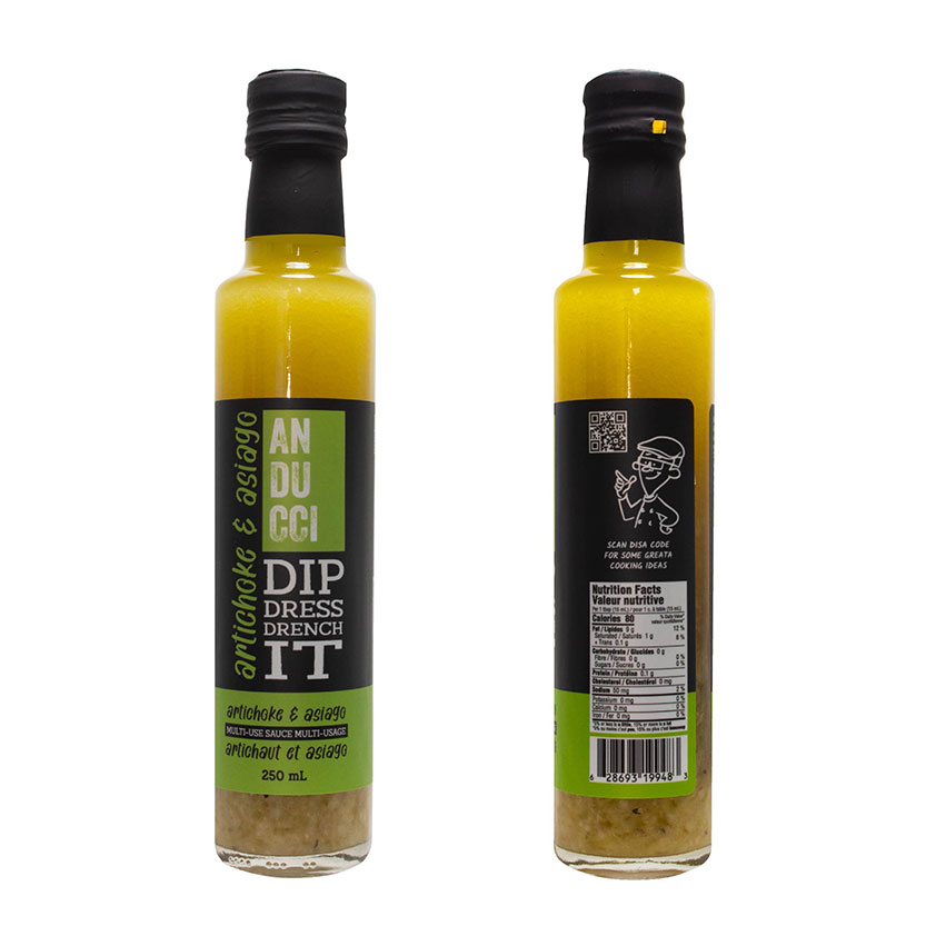 INGREDIENTS: Sunflower oil • White sine vinegar • Extra virgin olive oil •Artichokes (artichokes, water, salt, citric acid) • Water • Chardonnay wine vinegar • Garlic • Capers (capers, water, salt, vinegar) • Sea salt • Natural sour cream flavour • Natural cheese flavour •  Asiago cheese • Roasted garlic essence •  Xanthan gum • Black pepper
