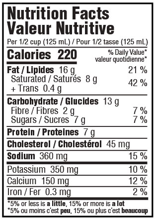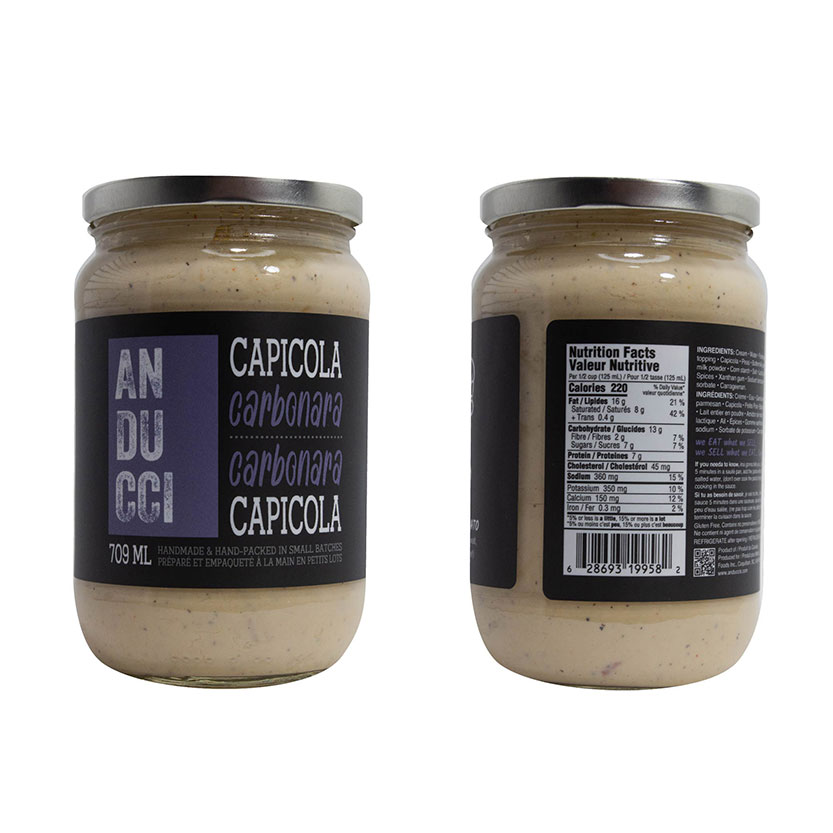 INGRÉDIENTS: Crème • L’eau • Fromage Parmesan [lait] • Capicola (porc salé) • Petits Pois • Lait Entier • Babeurre • Sel Acide Lactic • Acide Lactic Gomme Xanthane • Épices